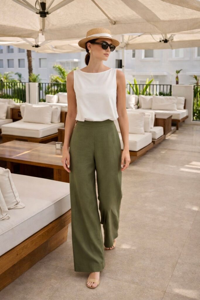 Para quem gosta de movimento, a pantalona em tecido leve é perfeita. Com regata ajustada ao corpo, o visual fica equilibrado e ideal tanto para o dia quanto para a noite.