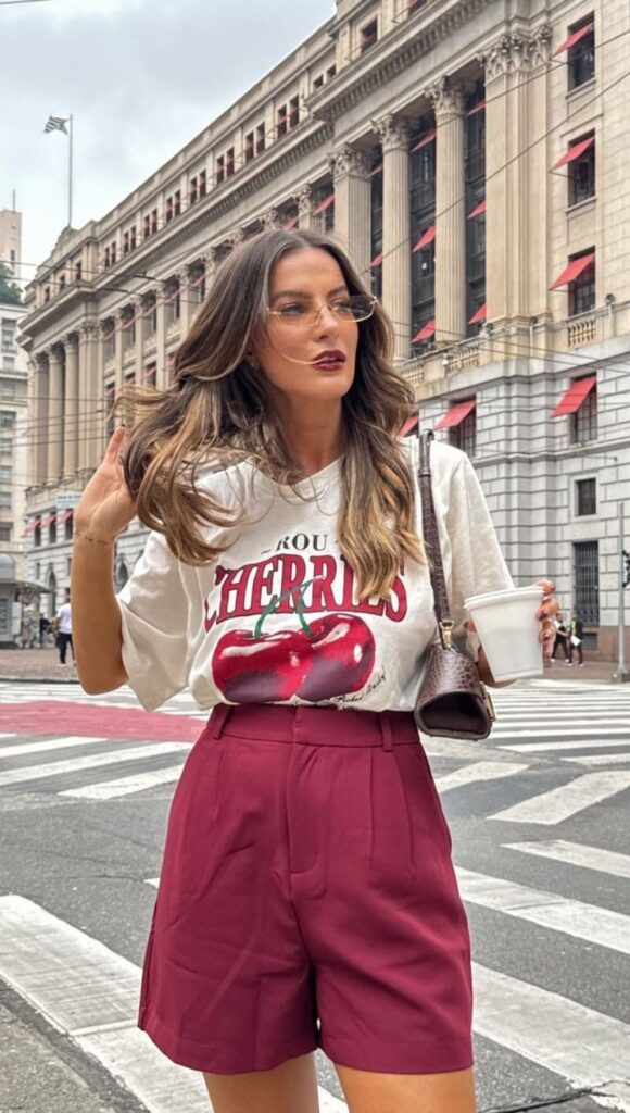 A mistura do casual com o elegante funciona sempre. A camiseta básica equilibra a sofisticação do shorts, criando uma produção moderna e confortável.