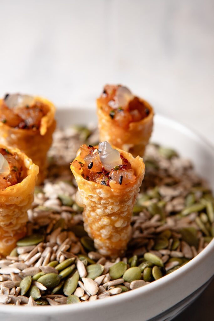 No jantar, o cardápio ganha mais complexidade, com entradas pensadas para compartilhar. Entre elas, Cannoli di Tonno (R$ 65), cone crocante com crudo de atum, azeite de páprica, gergelim e gel de maçã verde; e o “Whipped” Stracciatella, creme de burrata com tomates, uva verde e azeite de capim-limão, acompanhado de focaccia na brasa, e outros variados pratos.
