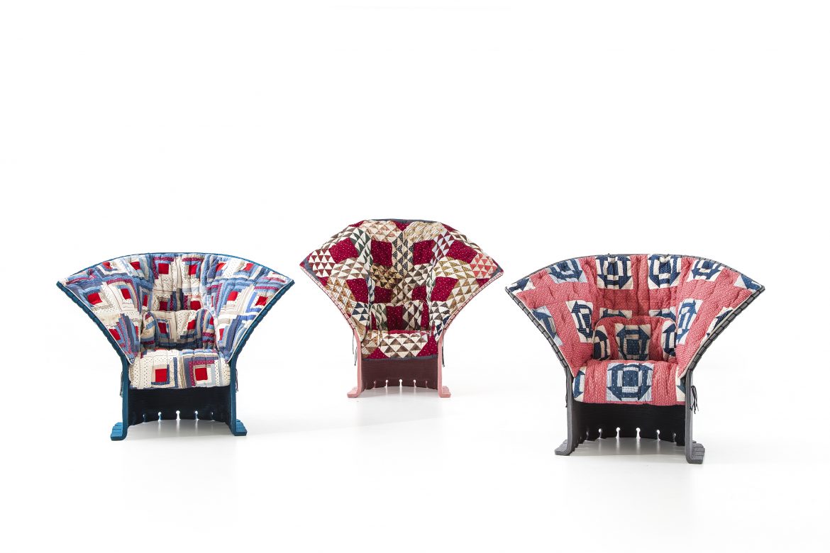 AS POLTRONAS, FEITAS EM PARCERIA COM A MARCA CASSINA, APRESENTAM COLCHAS AMERICANAS DO SÉCULO XIX E XX, SELECIONADAS POR RAF SIMONS