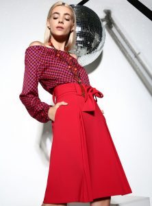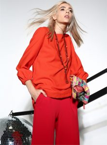 Com inspiração nos anos 70, a estilista Angela de Xavier trabalhou com cores fortes como laranja, rosa e vermelho. Destaque para as peças de cintura alta com amarrações, paletós alongados e sequinhos, super fashionistas!