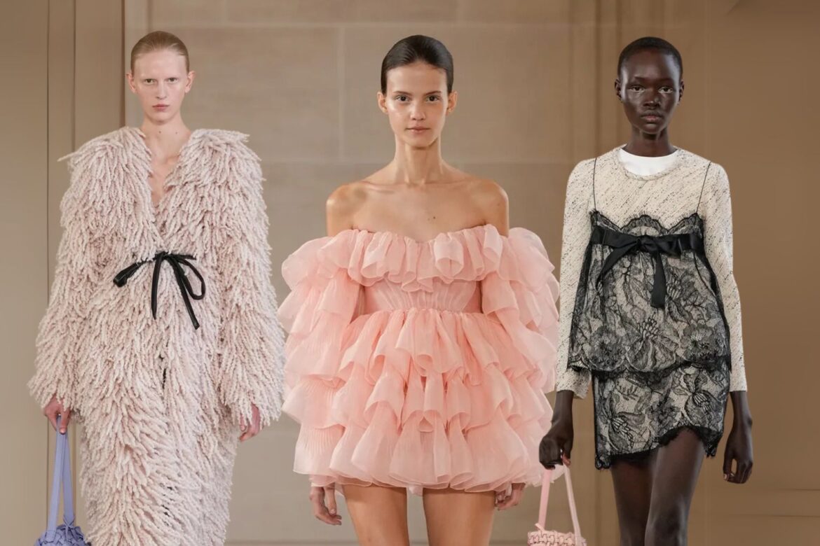 Os casacos e vestidos longos trazem modelagens esguias e caimentos impecáveis. Já os volumes surgem em mangas bufantes, saias balonê e camadas de babados tridimensionais. Bordados minuciosos, aplicações florais e plumas adicionam um toque artesanal. Essa riqueza de detalhes reforça a herança da alta-costura, transcendendo o conceito de prêt-à-porter.