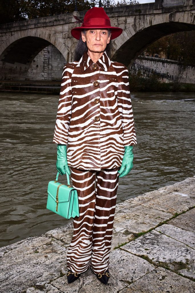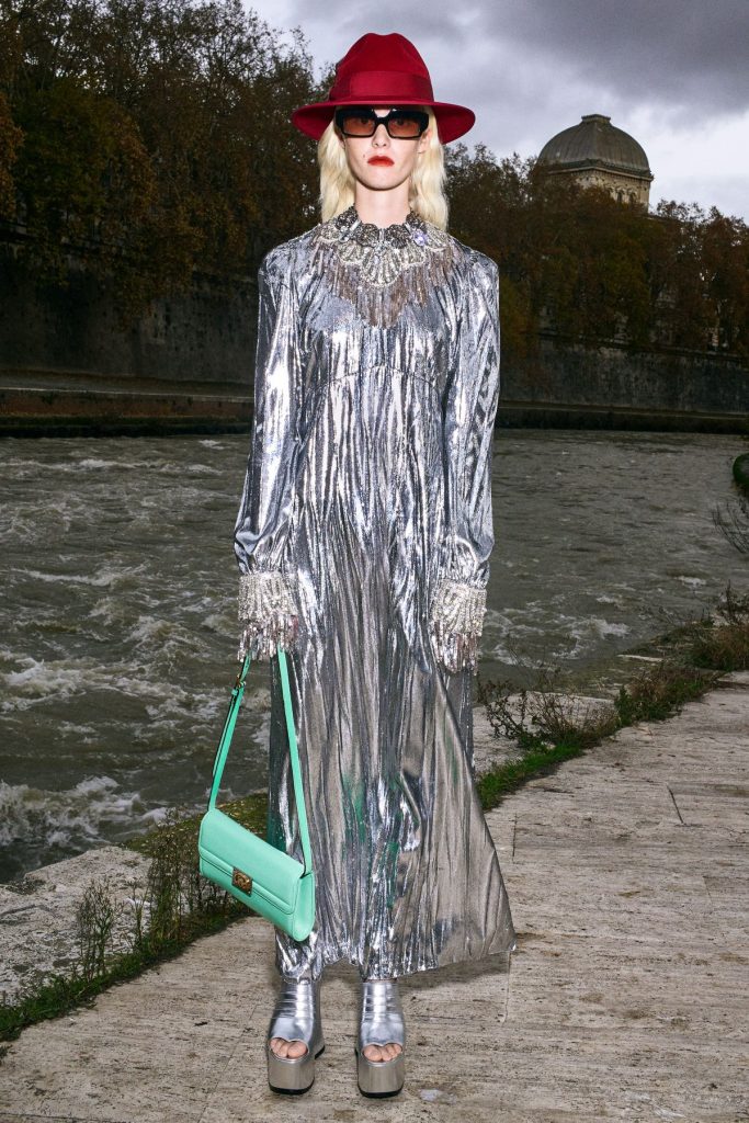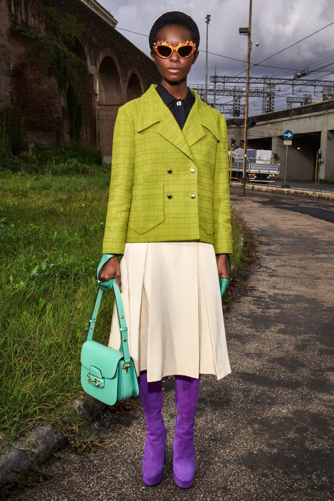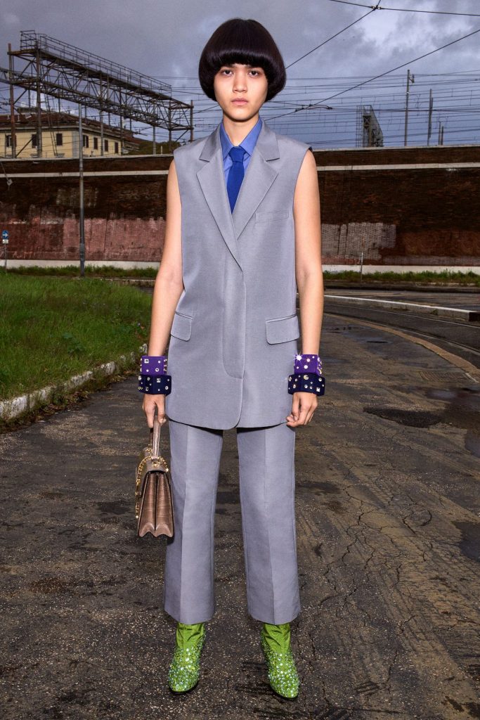 O estilista da marca, Alessandro Michele, conhecido pelos excessos em suas criações, desde a última temporada de desfiles já surpreendeu, desenvolvendo peças mais minimalistas, seguindo no mesmo estilo na coleção pre-fall 2020. Sua nova era trouxe uma alfaiataria mais voltada para o clássico, com o terno cinza de paletó sem mangas, e a saia preta de babados, combinada com regata oversized. O conjunto tradicional com casaco, colete e calça numa mesma padronagem, usado com camisa e gravata também compôs a coleção.