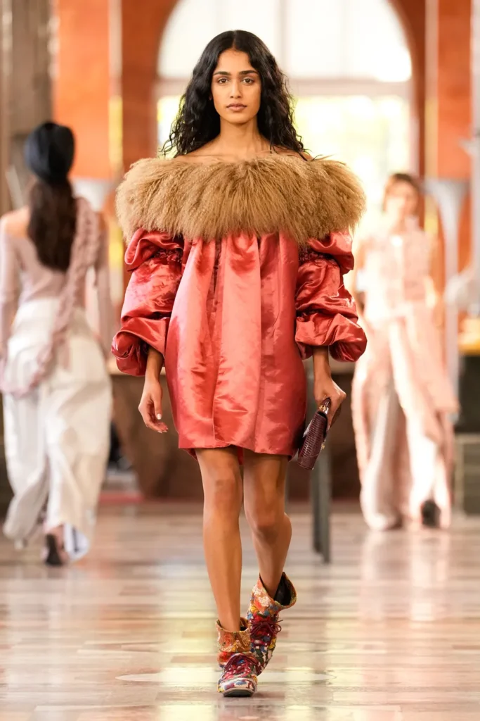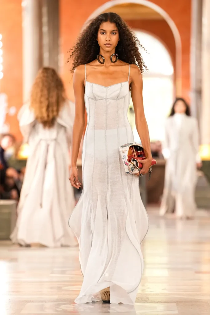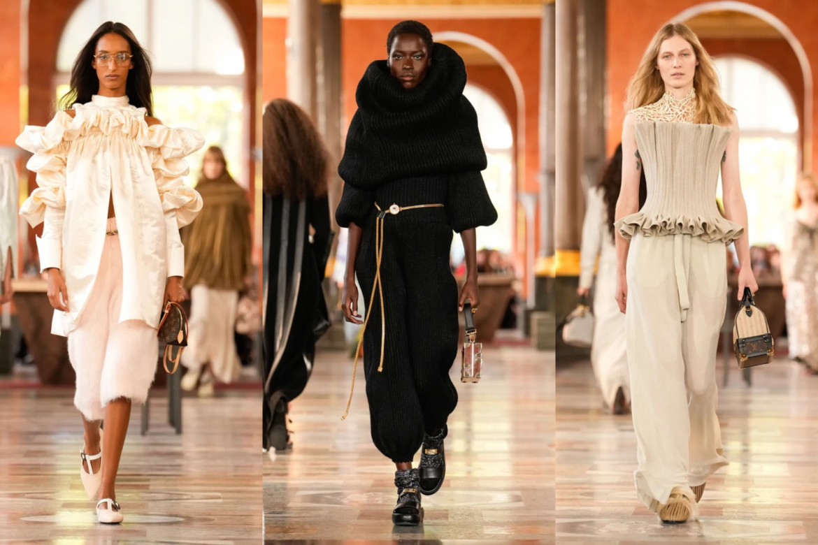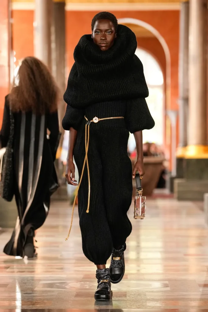 Além disso, a paleta cromática escolhida por Ghesquière serviu para reforçar esse contraste essencial. Por um lado, tons neutros e suaves — como branco, bege e cinza — trouxeram a sensação de conforto e familiaridade. Por outro lado, eles foram habilmente equilibrados pela vivacidade de rosas suaves e a intensidade de vermelhos marcantes. A coleção, entretanto, encontrou um tom mais denso e finalista com o peso do preto, que encerrou o desfile com solidez e drama.