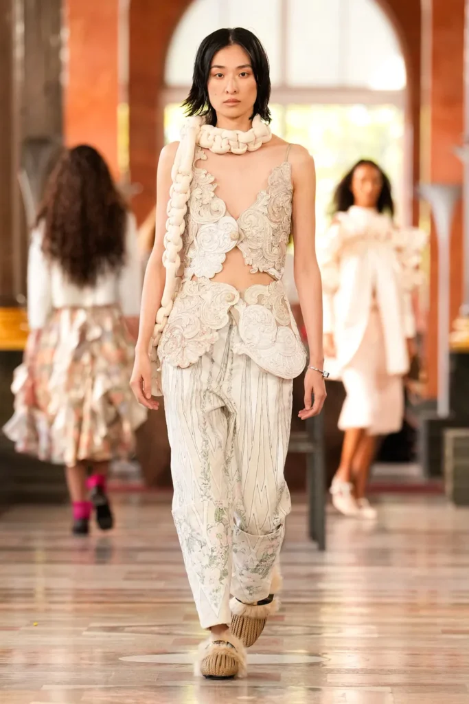 De fato, o que se viu foi um intrigante diálogo de contrastes. Peças que remetem ao conforto privado, como camisolas de renda moletom cinza e tricôs intencionalmente volumosos, ganharam uma nova e surpreendente dimensão. Isso ocorreu ao se encontrarem com a rigidez e o artifício de corsets estruturados, o refinamento de drapeados clássicos e as formas geométricas que caracterizam uma inspiração nitidamente futurista. O resultado final é uma reflexão poderosa que coloca em perspectiva o próprio ato de vestir, celebrando-o como um verdadeiro gesto de liberdade estética.