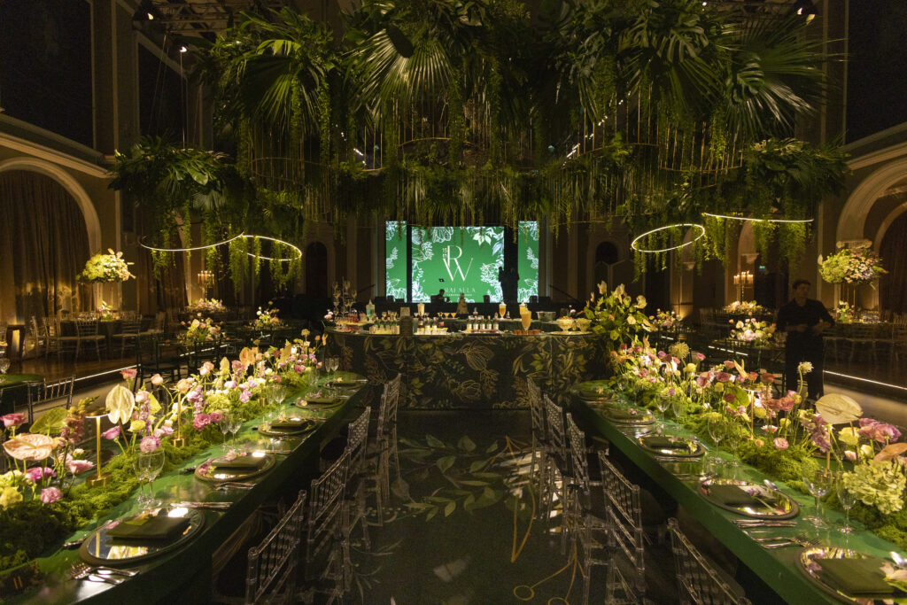 Rafaela escolheu os salões Leopoldina e Imperatriz, da Associação Leopoldina Juvenil, como cenário da celebração. Diferente do tradicional, ela optou por uma decoração em tons de verde e, nesse cenário, uma grande instalação com plantas ornamentais no teto e arranjos com flores exóticas em tons de rosa conferiram elegância ao ambiente assinado.