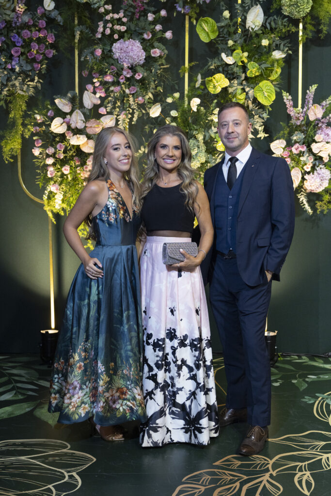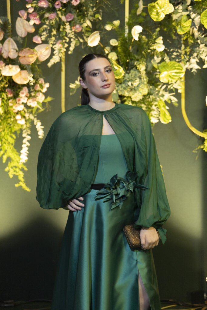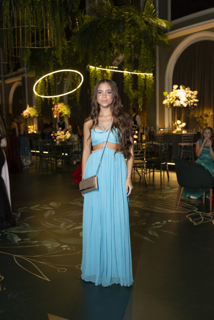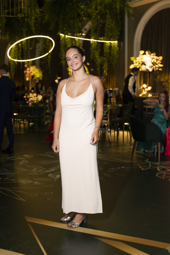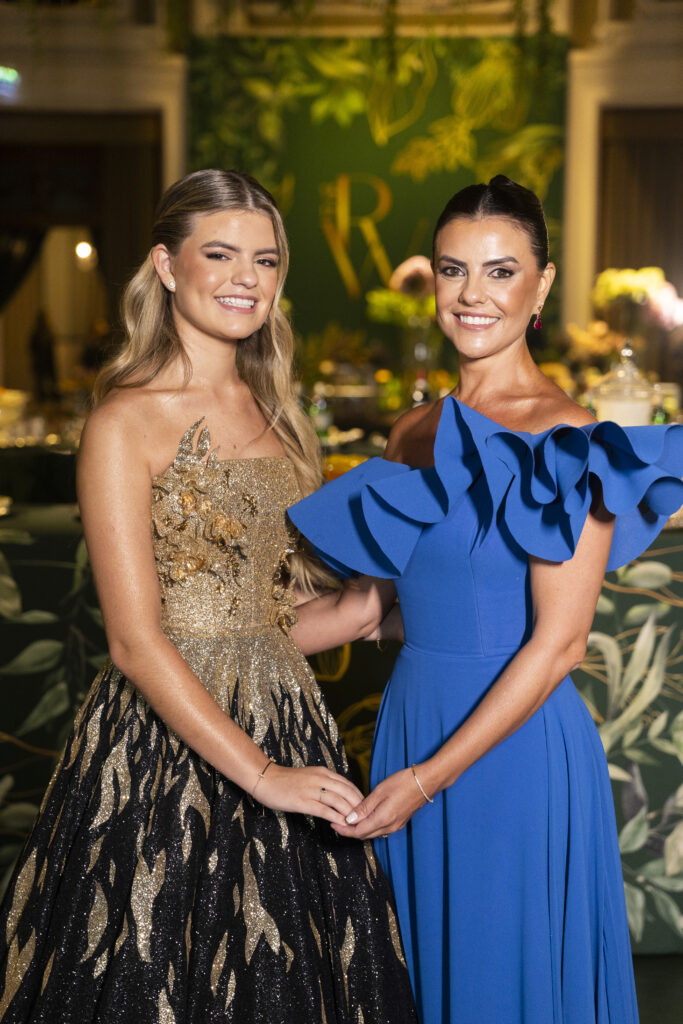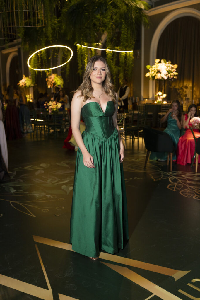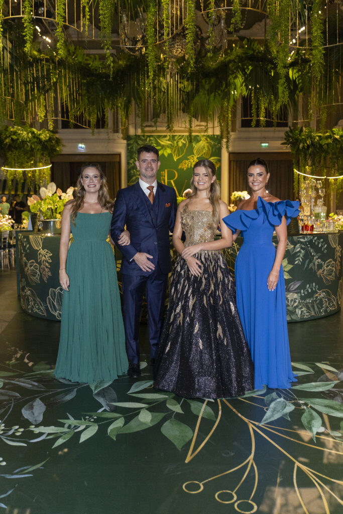 Para sua grande noite, a aniversariante elegeu três criações exclusivas da estilista Eduarda Galvani. A estilista também assinou os looks da mãe e da irmã. Essa escolha garantiu uma unidade estética sofisticada para toda a família.