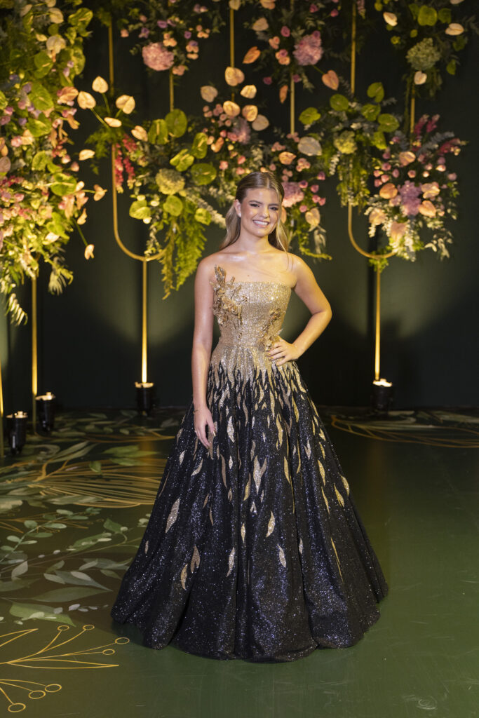 Essa técnica criou uma continuidade visual que valoriza ainda mais a silhueta. Além disso, o bordado 3D se espalhou por toda a peça, refletindo a luz a cada movimento. Na sequência, para a balada, o comprimento mini entrou em cena. Mais uma vez, o preto e o dourado apareceram em contraste e brilho. A proposta construiu um final marcante, intenso e cheio de personalidade para a pista.