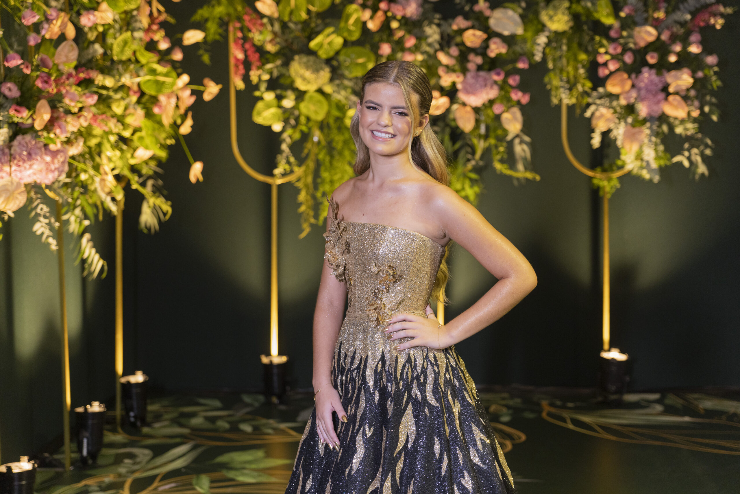 Na recepção, a aniversariante brilhou em um modelo dramático e sofisticado. O vestido apresentava um degradê em preto e dourado, com bordados em cristais em formatos geométricos. Dando continuidade à noite, o dourado assumiu o protagonismo na hora da valsa. Nesse momento, o corpo e a saia passaram a compartilhar a mesma textura.