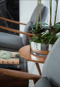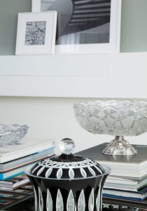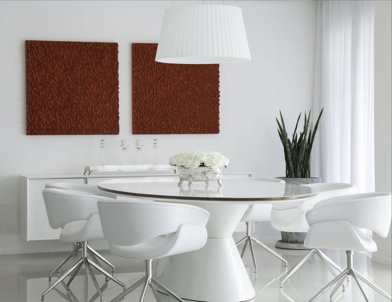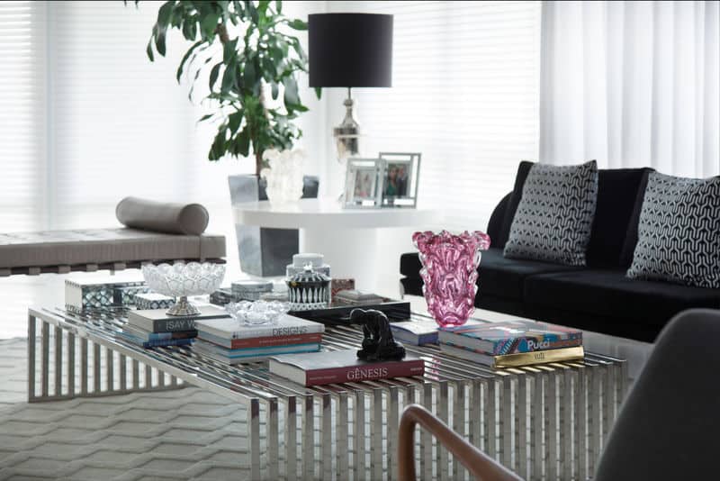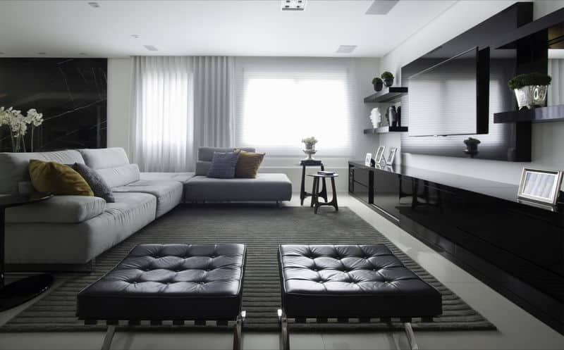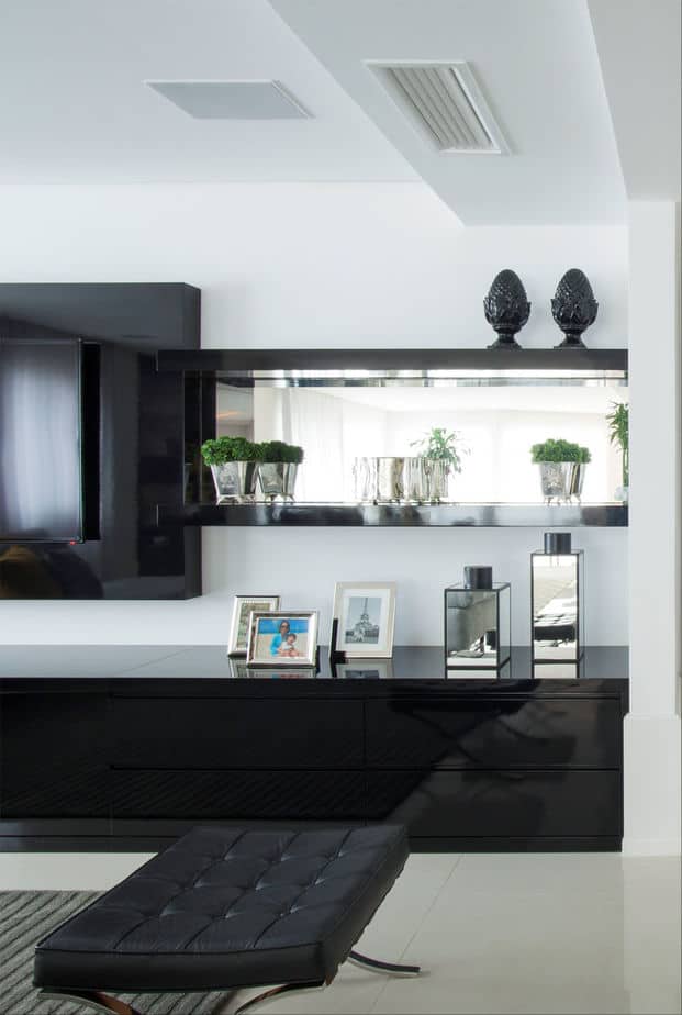 A cor é destaque, pontualmente, nos quadros vermelhos da artista Heloísa Crocco, localizados próximos da mesa de jantar, e no vaso de murano, localizado na mesa de centro, entre os sofás e as poltronas cinzas da Saccaro. A sala de estar, onde é possível perceber o contraste com a claridade do ambiente conjugado, possui o móvel da televisão executado em marcenaria. A peça, desenvolvida em laca preta de alto brilho, acompanha toda a extensão da parede. Um lindo sofá de canto da Gobbi Novelle traz o conforto desejado e delimita o espaço entre os dois ambientes.