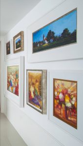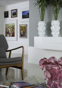 Na entrada, quem chega à residência, se depara com uma parede preenchida com quadros do artista e pintor Erico Santos e do artista plástico Antônio Soriano. A sensação de amplitude também ganha espaço com a integração dos ambientes, dominados por tons neutros, como preto, cinza e branco.