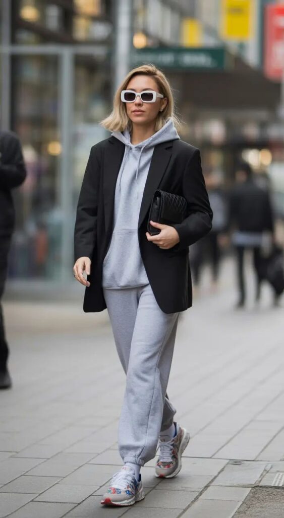 Misturar o blazer com itens esportivos é uma forma atual de trazer casualidade ao look. Usar um blazer por cima de um moletom, por exemplo, cria uma produção urbana e cheia de personalidade.